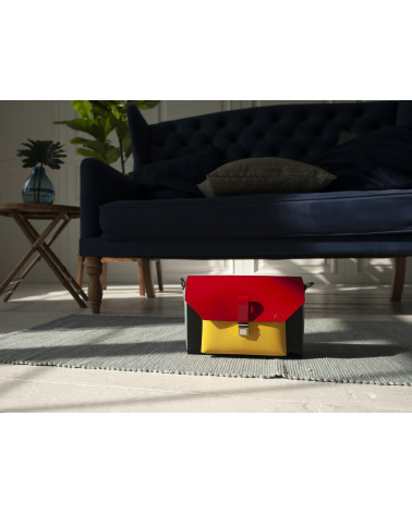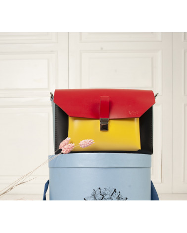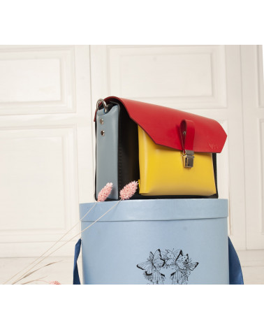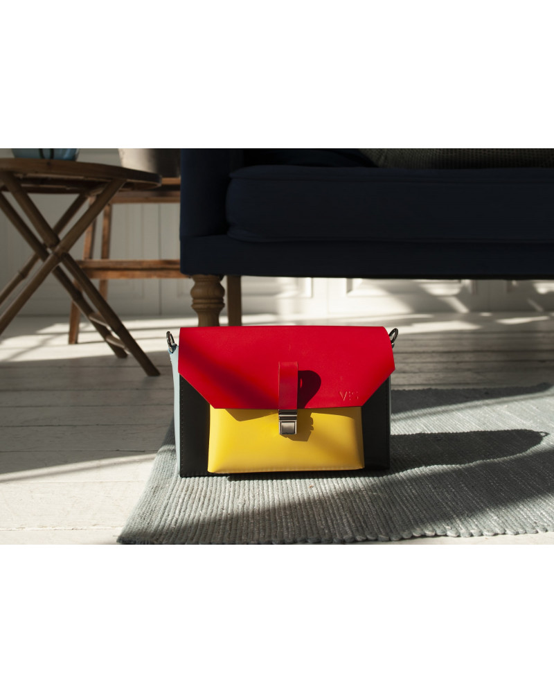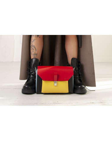 На фото Гелена:сумка у поєднонні чорного, жовтого, блакитного та червоного кольорів.