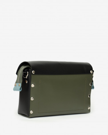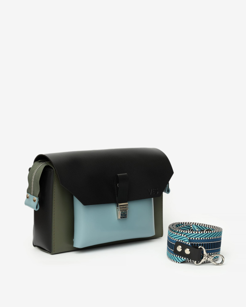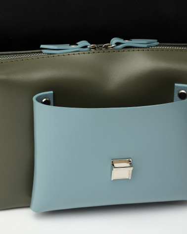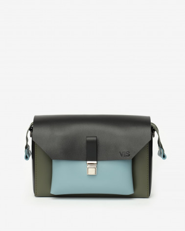 На фото Гелена:сумка у поєднонні оливкового, блакитного та чорного кольорів.