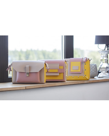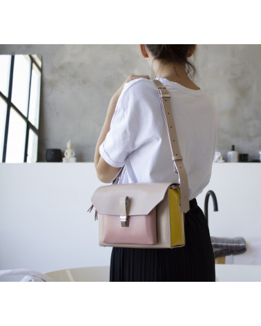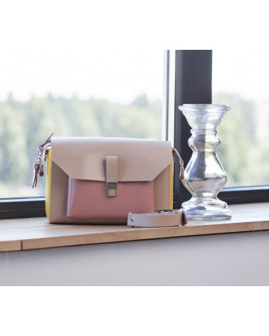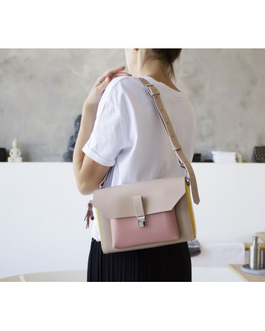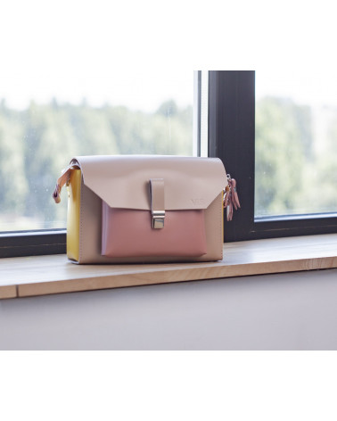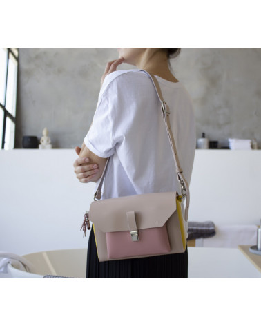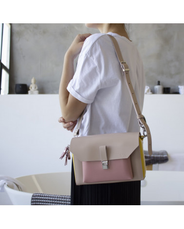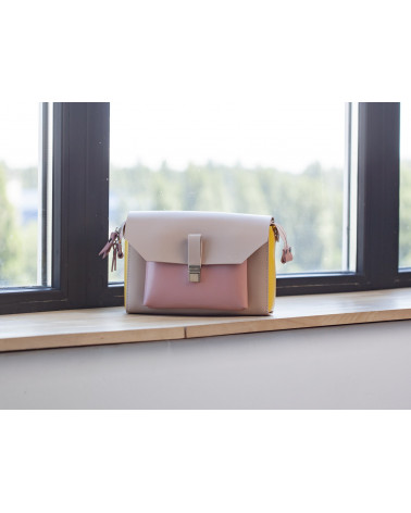 На фото Гелена:сумка у поєднонні жовтого, рожевого та пудрового кольорів.