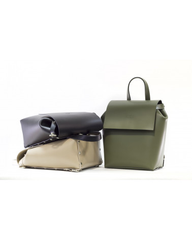 Корпус виготовлено з натуральної шкіри українського виробництва. Основне відділення закривається на кришку-клапан. Всередині - одне відділення та дві кишені з фетру. За допомогою ремінців у верхній частині корпусу можна змінювати ширину корпусу зверху.