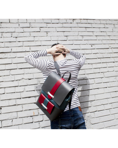 На фото Краз:рюкзак у поєднанні смарагдового, червоного, білого кольорів.