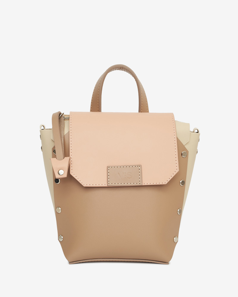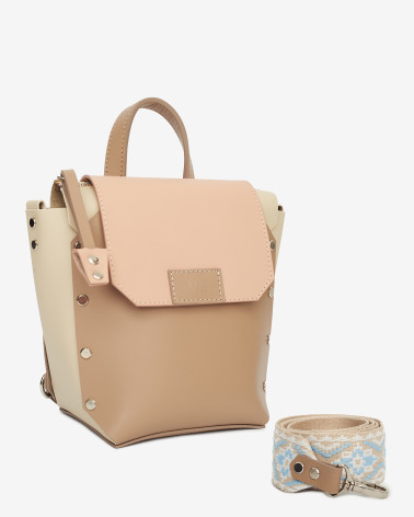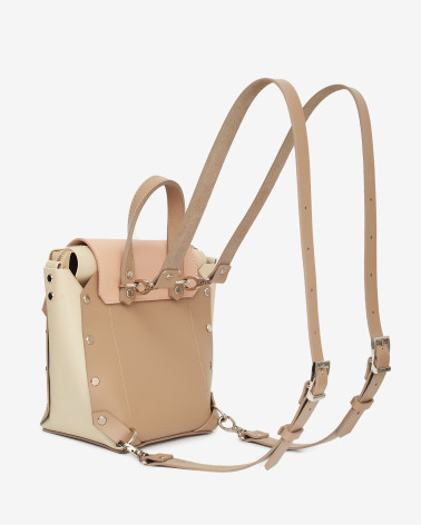 Корпус виготовлено зі шкіри українського виробництва. Основне відділення закривається на блискавку, кришку-клапан та магніт. Всередині рюкзака одне відділення та кишеня з фетру. Зовні рюкзак доповнено короткою ручкою, яка дозволяє носити його у руці. Також у комплекті є три довгі ручки. За допомогою широкої ручки зі щільної стрічки ви можете легко трансформувати рюкзак у сумку (для цього використовуються кріплення на бокових стінках рюкзака).Крім того, використовуючи дві інших ручки зі шкіри та кріплення на задній стінці рюкзака, ви можете носити його як рюкзак. Ці функції стають досить доречними у людних місцях.