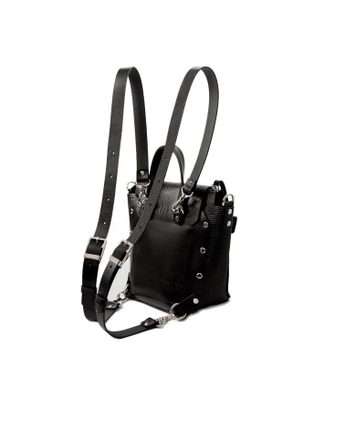 Корпус виготовлено зі шкіри українського виробництва. Основне відділення закривається на блискавку, кришку-клапан та магніт. Всередині рюкзака одне відділення та кишеня з фетру. Зовні рюкзак доповнено короткою ручкою, яка дозволяє носити його у руці. Також у комплекті є три довгі ручки. За допомогою широкої ручки зі щільної стрічки ви можете легко трансформувати рюкзак у сумку (для цього використовуються кріплення на бокових стінках рюкзака).Крім того, використовуючи дві інших ручки зі шкіри та кріплення на задній стінці рюкзака, ви можете носити його як рюкзак. Ці функції стають досить доречними у людних місцях.