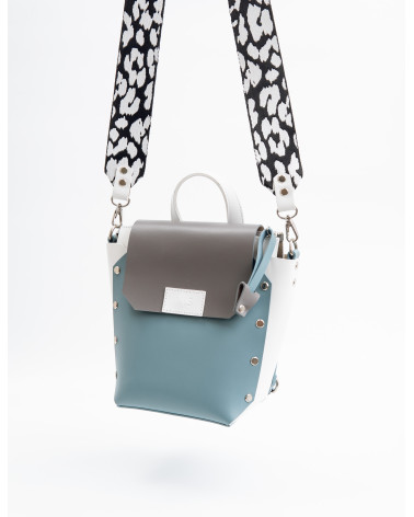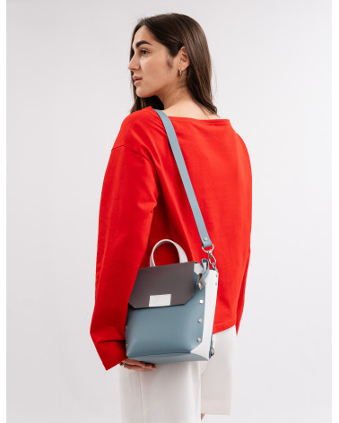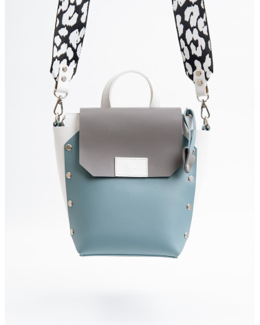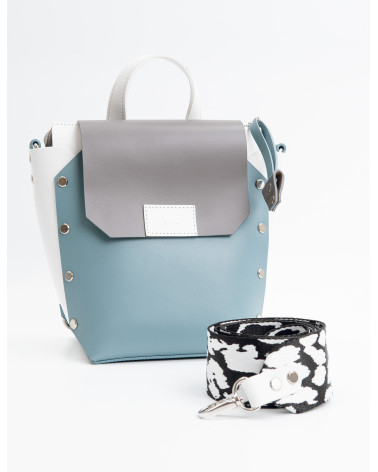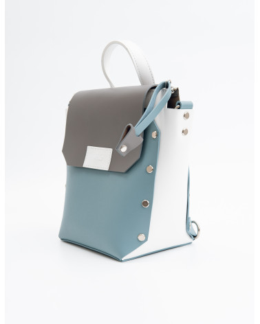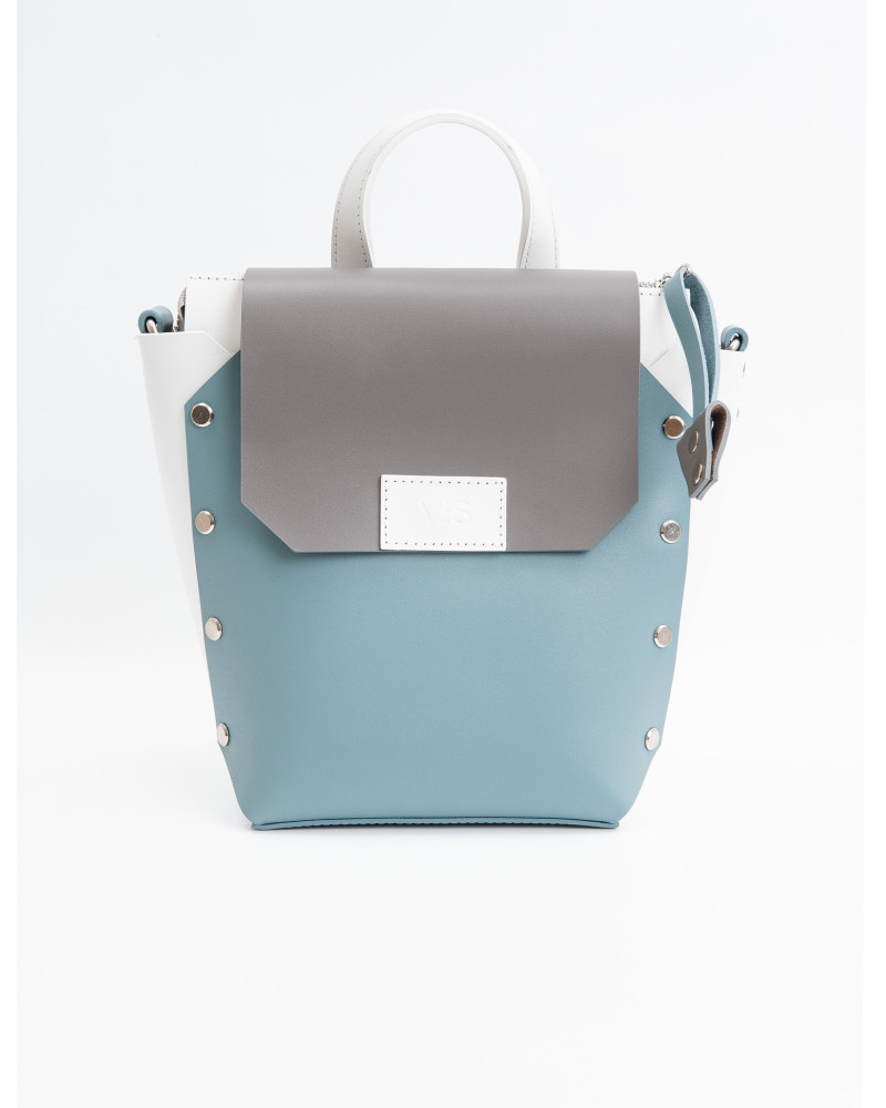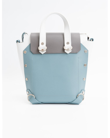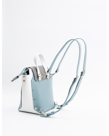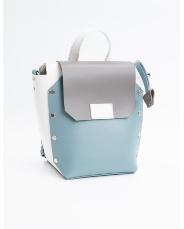 На фото Адара:рюкзак у поєднанні блакитного, білого та сірого.