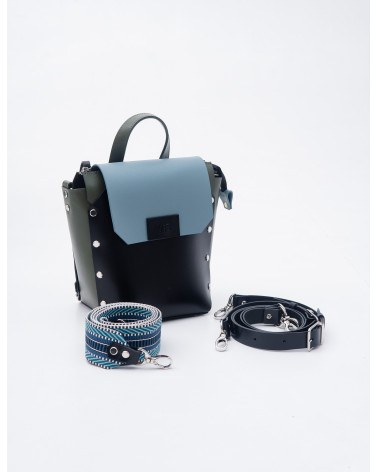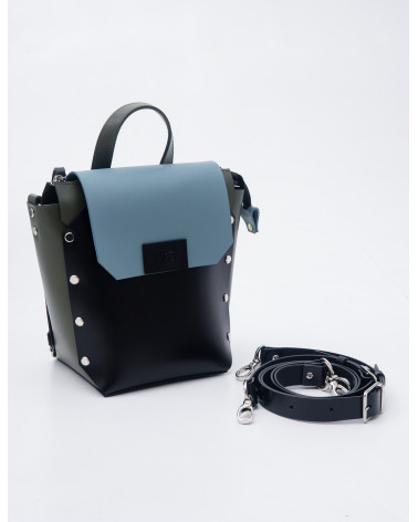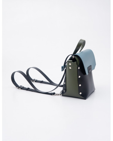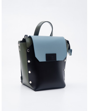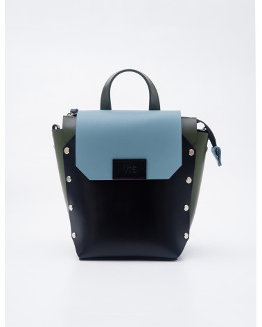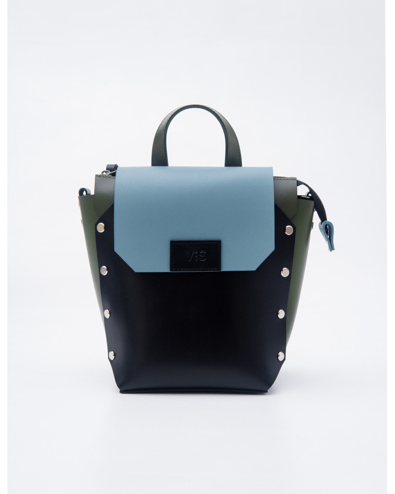 На фото Адара:рюкзак у поєднанні чорного, оливкового та блакитного.
