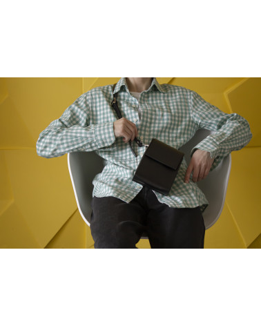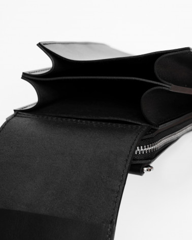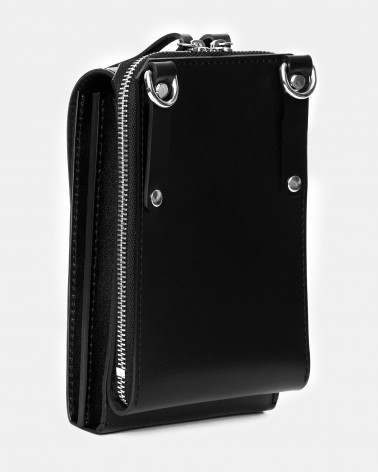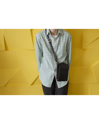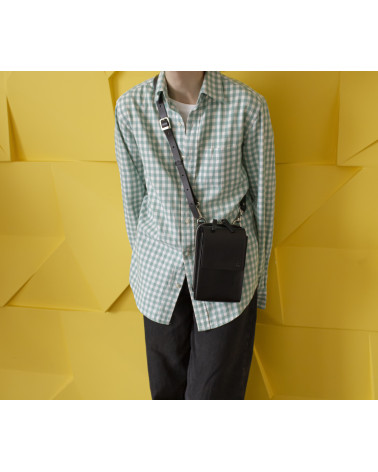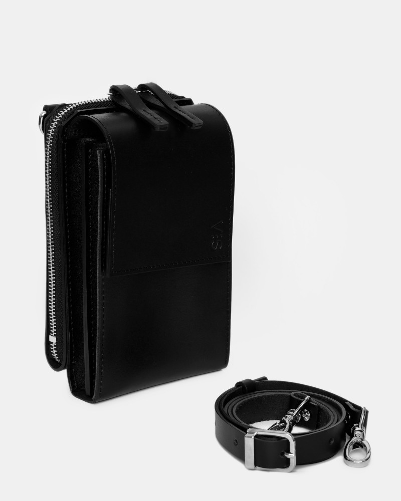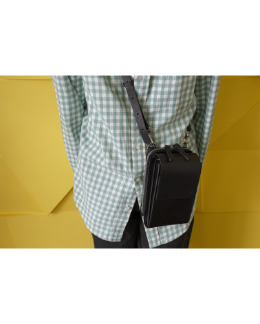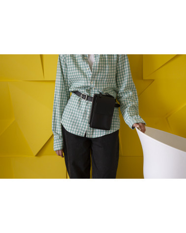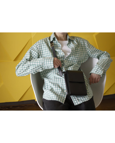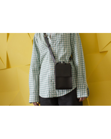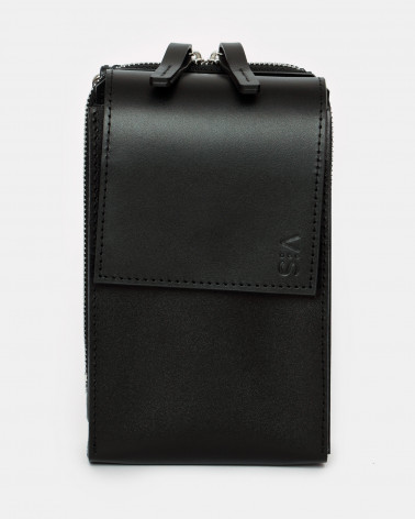 Корпус виготовлено зі шкіри українського виробництва. Основне відділення закривається на блискавку. Всередині сумочки три відділення та таємна кишенька для дрібничок. Ззовні модель доповнено зручною кишенею на блискавці. Модель Ексліпс:сумка створена, як варіація сумки для телефону. Тому, залежно від розміру вашого телефону, його можна зручно розміщувати у зовнішній кишені чи в основному відділенні сумки. За допомогою спеціальних кріплень на зворотньому боці сумочки, її можна носити на талії.