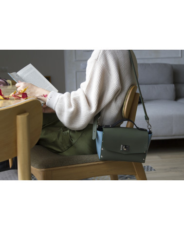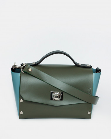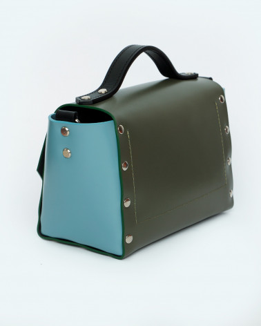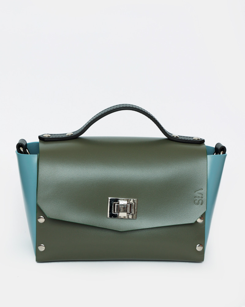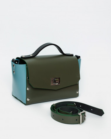 На фото Антарес:портфель у поєднанні оливкового, блакитного та чорного кольорів.