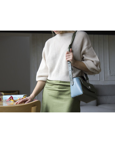 Корпус виготовлено з натуральної шкіри українського виробництва. Основне відділення закривається на кришку-клапан. Всередині - одне відділення, кишенька з фетру для ключів/телефону/дрібниць. За допомогою ремінців регулювання на боках "вушок" можна змінювати зовнішній вигляд сумочки та її розмір. У комплекті є зйомна довга ручка, яка може бути повністю зі шкіри чи у поєднанні з ланцюжком.