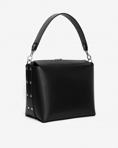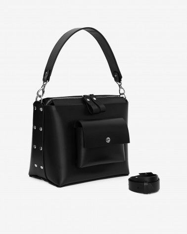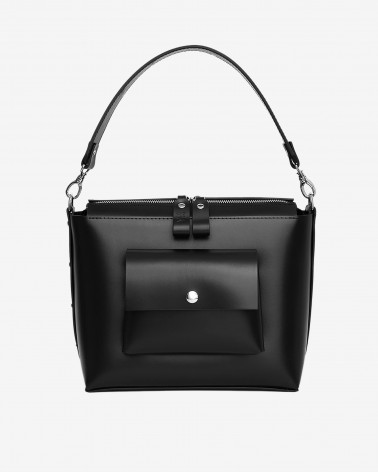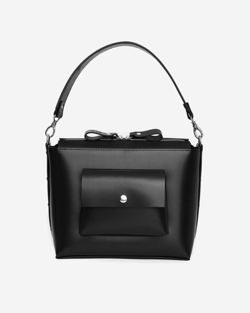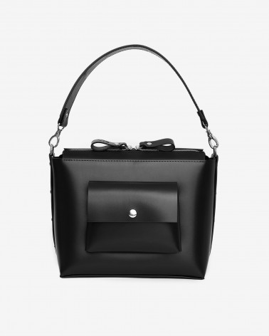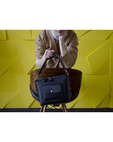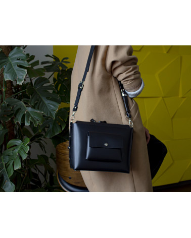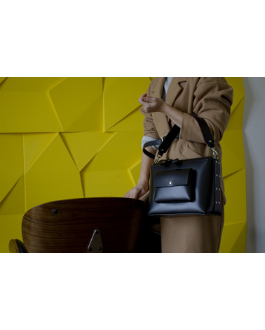 Корпус виготовлено з натуральної шкіри українського виробництва. Основне відділення закривається на блискавку. Всередині сумочки одне відділення та дві кишеньки з фетру для телефону/ключів/різних дрібниць. Широка коротка ручка дозволяє зручно носити сумочку у руці чи на передпліччі. Ззовні сумочку доповнено кишенею, яка закривається на замок та дозволяє легко та швидко знаходити найнеобхідніше. У комплекті є зйомна довга ручка.