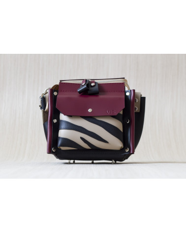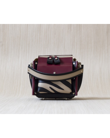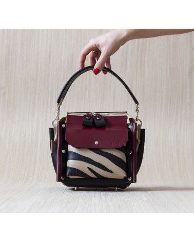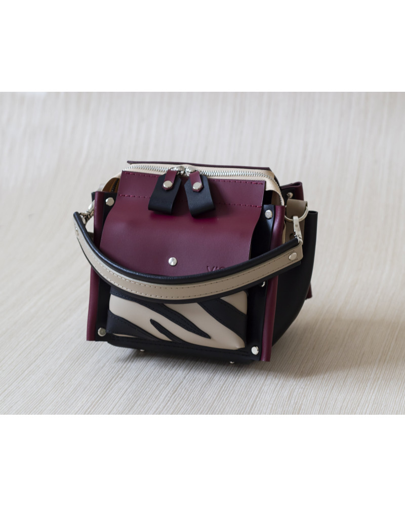 Корпус виготовлено з натуральної шкіри українського виробництва. Основне відділення закривається на блискавку. Всередині сумочки одне відділення та дві кишеньки з фетру для телефону/ключів/різних дрібниць. Широка коротка ручка дозволяє надзвичайно зручно носити сумочку у руці чи на передпліччі. Ззовні сумочку доповнено кишенею, яка закривається на магніт та дозволяє легко та швидко знаходити найнеобхідніше. У комплекті є зйомна довга ручка.