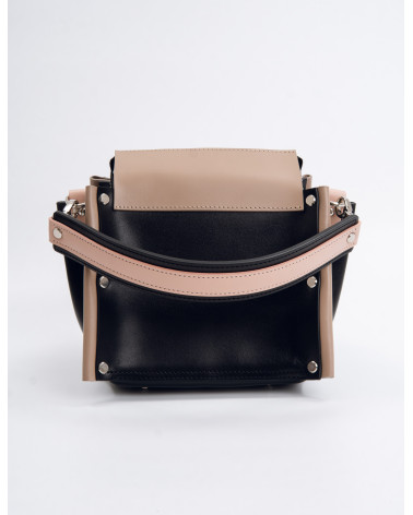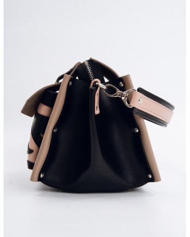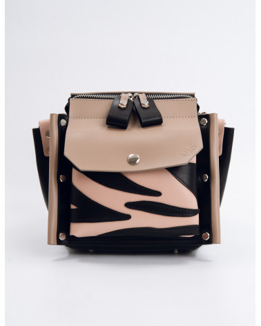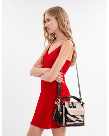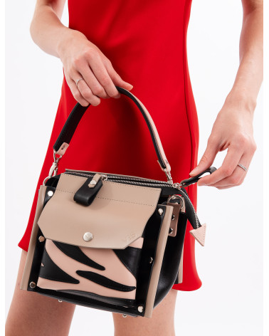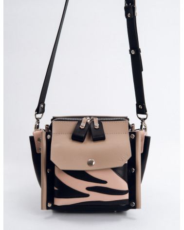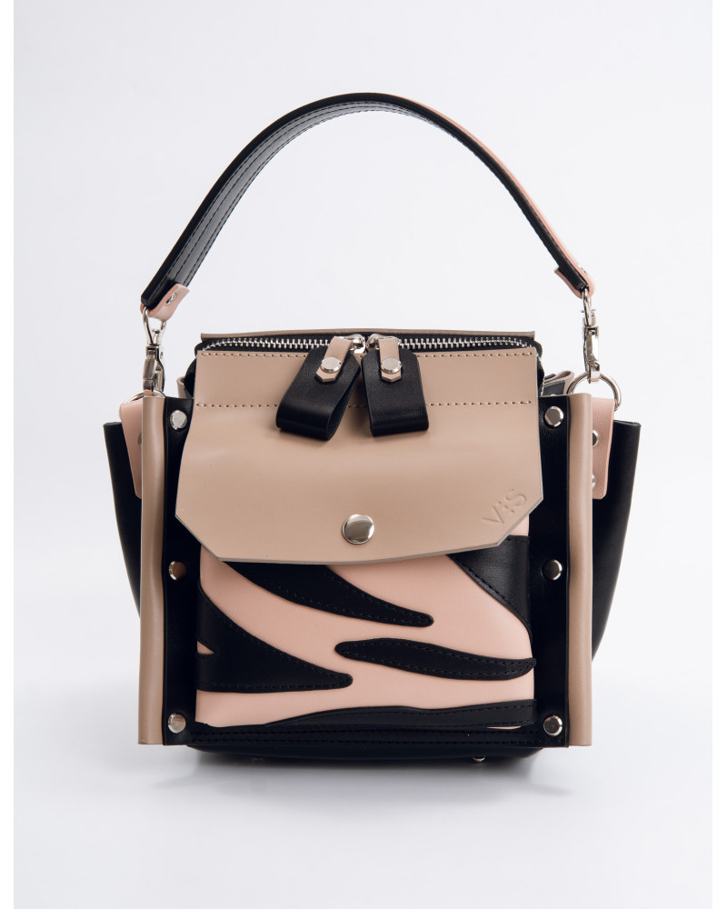 На фото поєднання чорного,бежевого та пудрового кольору. А також, сумочка доповонена аплікацією "зебра".