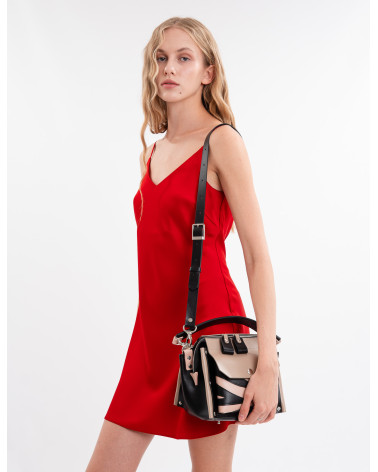 Корпус виготовлено з натуральної шкіри українського виробництва. Основне відділення закривається на блискавку. Всередині сумочки одне відділення та дві кишеньки з фетру для телефону/ключів/різних дрібниць. Широка коротка ручка дозволяє надзвичайно зручно носити сумочку у руці чи на передпліччі. Ззовні сумочку доповнено кишенею, яка закривається на магніт та дозволяє легко та швидко знаходити найнеобхідніше. У комплекті є зйомна довга ручка.
