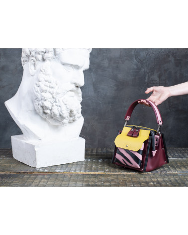 Корпус виготовлено з натуральної шкіри українського виробництва. Основне відділення закривається на блискавку. Всередині сумочки одне відділення та дві кишеньки з фетру для телефону/ключів/різних дрібниць. Широка коротка ручка дозволяє надзвичайно зручно носити сумочку у руці чи на передпліччі. Ззовні сумочку доповнено кишенею, яка закривається на магніт та дозволяє легко та швидко знаходити найнеобхідніше. У комплекті є зйомна довга ручка.