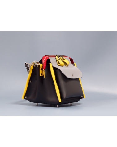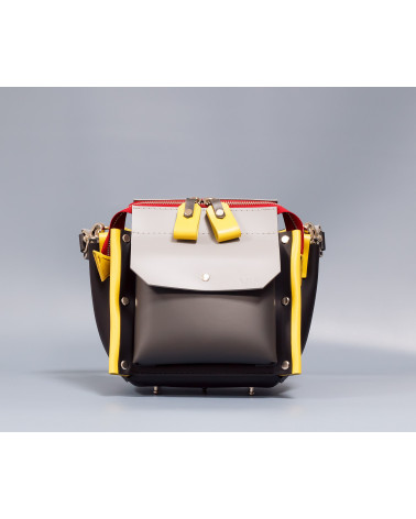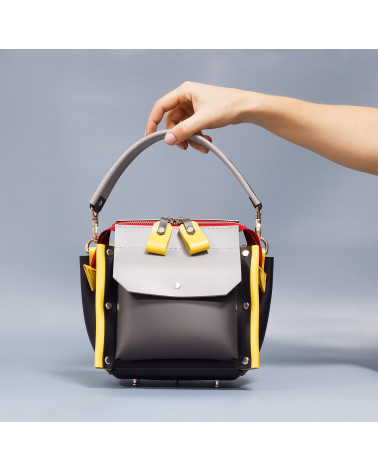 Корпус виготовлено з натуральної шкіри українського виробництва. Основне відділення закривається на блискавку. Всередині сумочки одне відділення та дві кишеньки з фетру для телефону/ключів/різних дрібниць. Широка коротка ручка дозволяє надзвичайно зручно носити сумочку у руці чи на передпліччі. Ззовні сумочку доповнено кишенею, яка закривається на магніт та дозволяє легко та швидко знаходити найнеобхідніше. У комплекті є зйомна довга ручка.