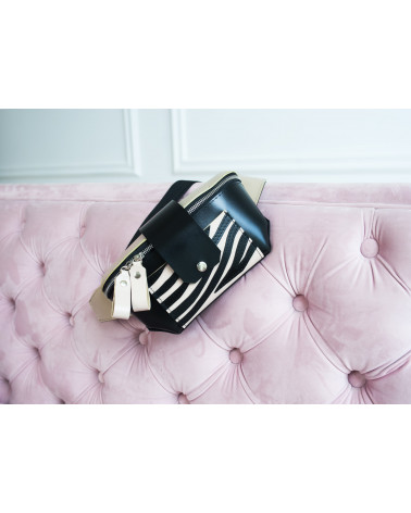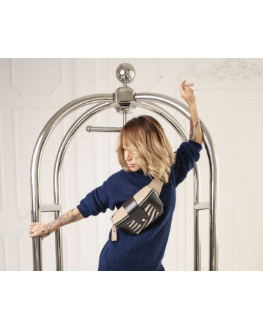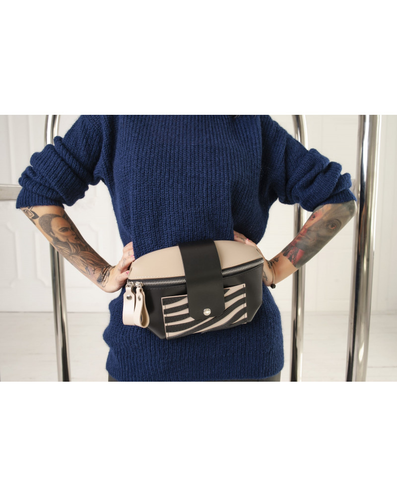 Корпус виготовлено зі шкіри українського виробництва. Основне відділення закривається на кришку-клапан, кнопку та блискавку. Всередині сумочки одне відділення та кишенька з фетру для документів, ключів та різних дрібниць. Зовні сумочка доповнена ременем зі щільної стрічки. Довжину ременю можна регулювати, щоб зручно носити сумочку на талії чи crossbody. Особливістю стрічки для ременя є також ще те, що вона абсолютно не ковзає. Тому регулювання-перетягування стрічки буде зручніше робити двома руками. Однак, це завадить самовільному ковзанню, розтягуванню ременю під вагою сумочки. Ми використовуємо металевий фастекс (замок).