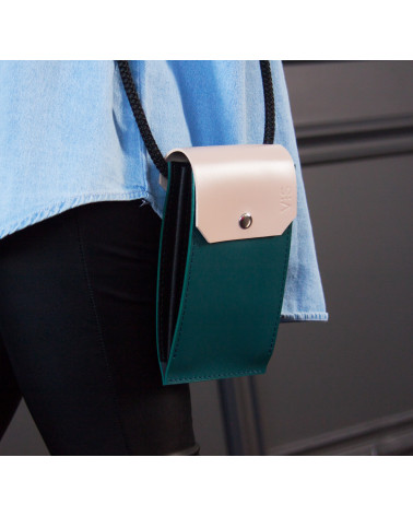 Корпус виготовлено зі шкіри українського виробництва. Основне відділення закривається на кришку-клапан та кнопку. Всередині сумочки два відділення. Ми рекомендуємо використовувати одне відділення сумочки для телефону, а друге у якості гаманця/ кейсу для павербанку/ карток, ключів, документів. У комплекті є ручка-шнур, яка дозволяє досить зручно носити сумочку crossbody чи, змінюючи довжину ременю, підкреслювати талію.