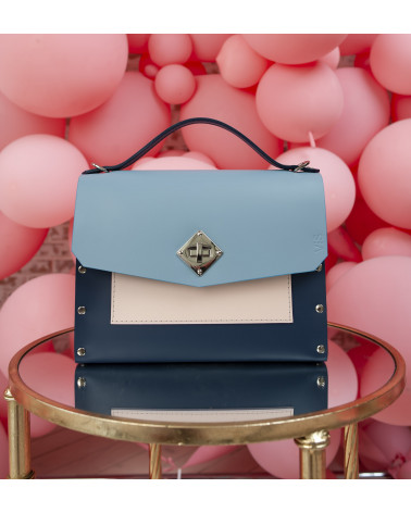 Корпус виготовлено з натуральної шкіри українського виробництва. Основне відділення закривається на кришку-клапан. Всередині - одне відділення, кишенька з фетру для ключів/телефону/дрібниць. Зовні корпус доповнено кишенею зі шкіри, що дозволяє швидко знаходити найнеобхідніше. Розмір сумочки легко вміщує в себе планшет, щоденник чи міні ноутбук. У комплекті є зйомна довга ручка.