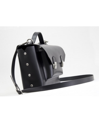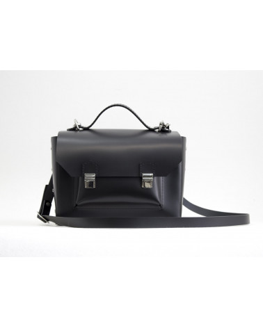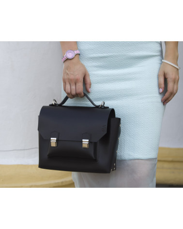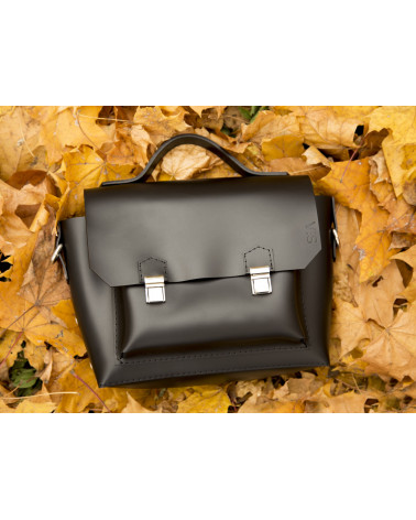 Основне відділення закривається на кришку-клапан та "клавішні" замки. Зверху сумочки є коротка ручка, за допомогою якої портфель можна носити у руці.