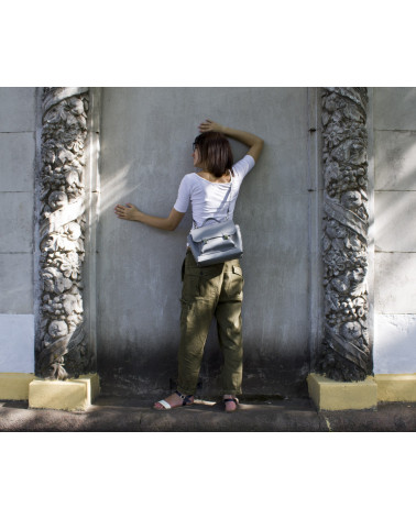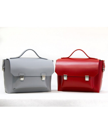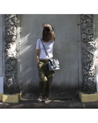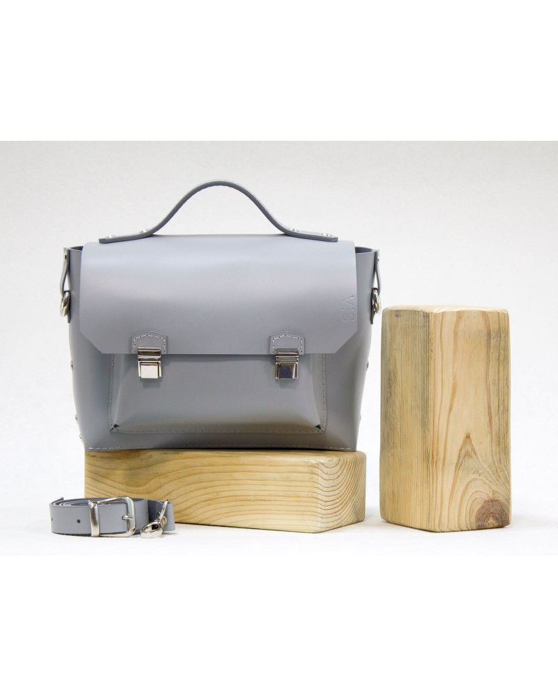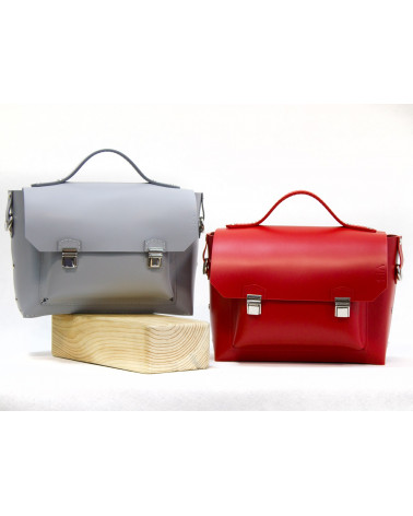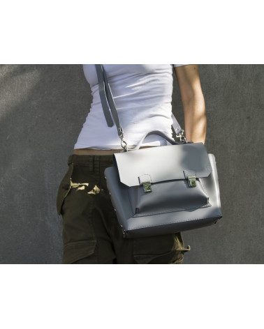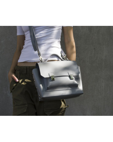 Корпус портфеля виготовлено зі шкіри українського виробництва. Всередині - одне відділення та кишенька з фетру для ключів/телефону/дрібниць. Зовні корпус доповнено кишенею, щоб з легкістю та швидко знаходити найнеобхідніше. Основне відділення закривається на кришку-клапан та "клавішні" замки. Зверху сумочки є коротка ручка, за допомогою якої портфель можна носити у руці.