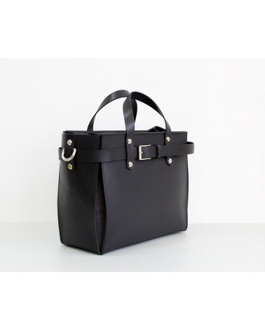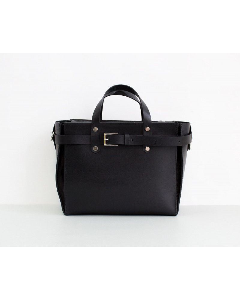 Корпус виготовлено зі шкіри українського виробництва. Основне відділення закривається на блискавку. Всередині сумочки одне відділення та дві кишеньки з фетру. Зовні сумочку доповнено ременем. Саме він регулює об'єм сумочки. Ви можете регулювати, перетягувати його довжину та робити сумочку більшою. Також ремінь має подвійне призначення та у випадку, коли ви без сумочки можете сміливо його використовувати як ремінь в одязі (так-так, для підкреслення талії). За допомогою коротких ручок сумочку зручно носити у руках чи на передпліччі. А також у комплекті є зйомна довга ручка.