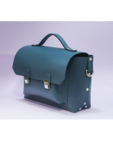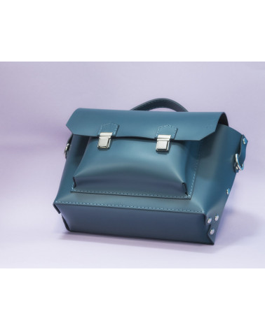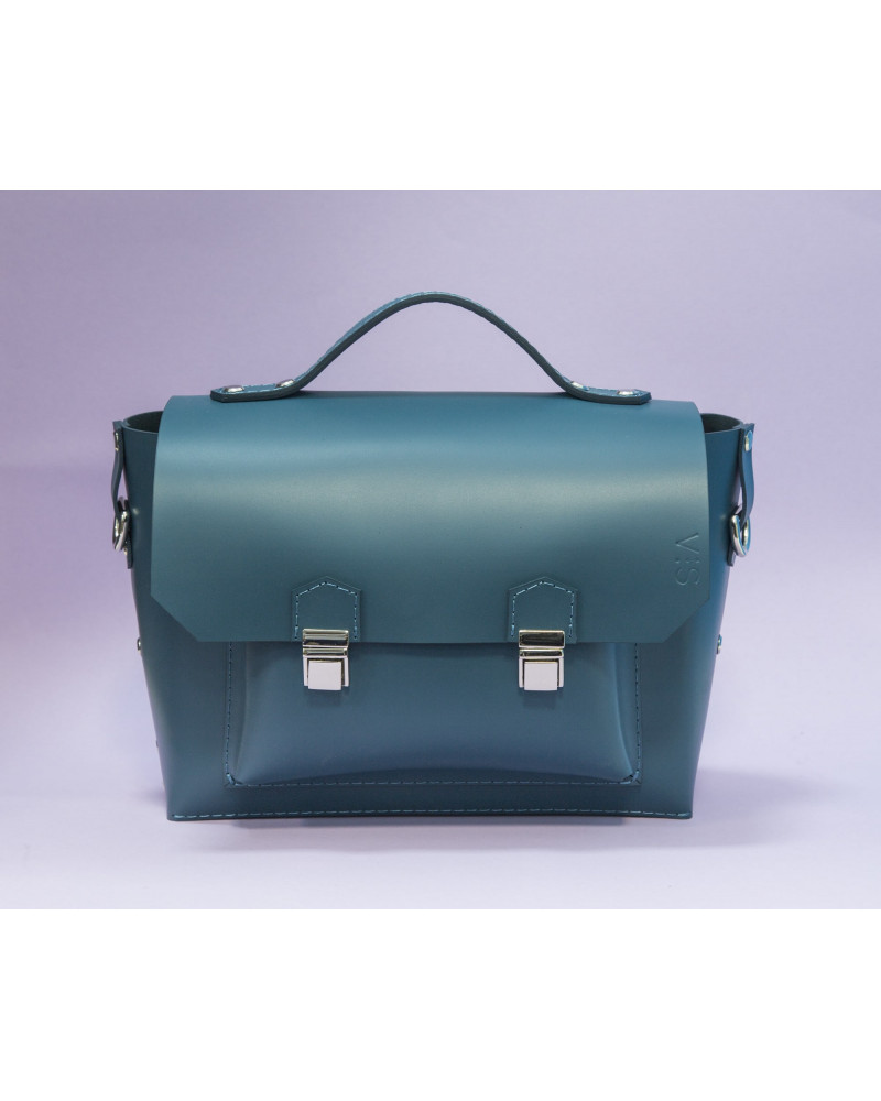 Корпус портфеля виготовлено зі шкіри українського виробництва. Всередині - одне відділення та кишенька з фетру для ключів/телефону/дрібниць. Зовні корпус доповнено кишенею, щоб з легкістю та швидко знаходити найнеобхідніше. Основне відділення закривається на кришку-клапан та "клавішні" замки. Зверху сумочки є коротка ручка, за допомогою якої портфель можна носити у руці.