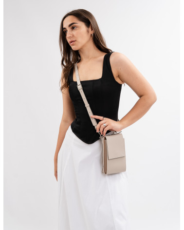 Корпус виготовлено зі шкіри українського виробництва. Основне відділення закривається на блискавку. Всередині сумочки три відділення та таємна кишенька для дрібничок. Ззовні модель доповнено зручною кишенею на блискавці. Модель Ексліпс:сумка створена, як варіація сумки для телефону. Тому, залежно від розміру вашого телефону, його можна зручно розміщувати у зовнішній кишені чи в основному відділенні сумки. За допомогою спеціальних кріплень на зворотньому боці сумочки, її можна носити на талії.