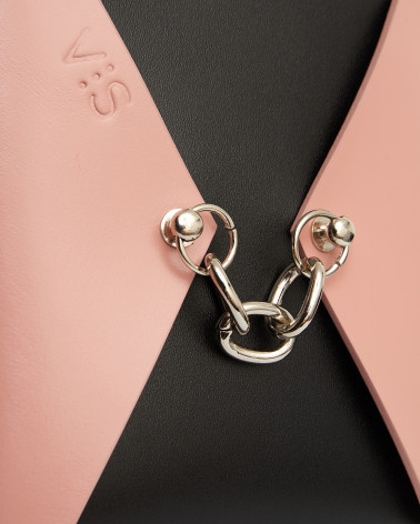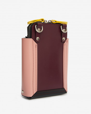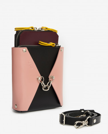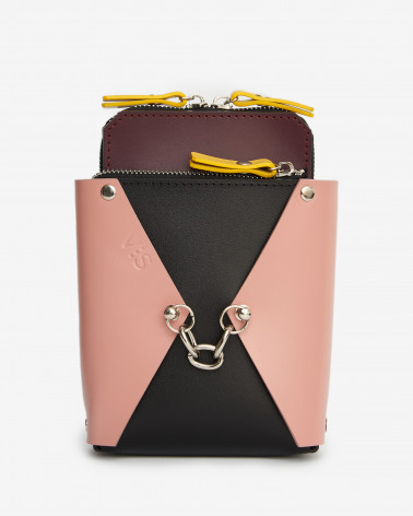 На фото Талія:сумка у поєднання чорного, рожевого, жовтого та кольору марсала.