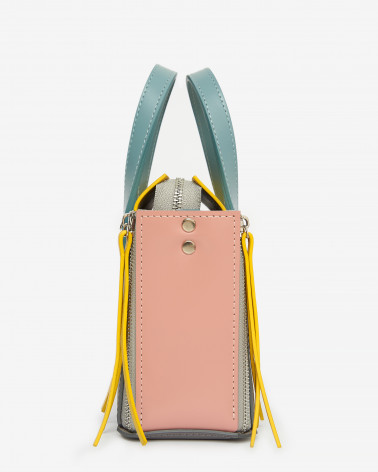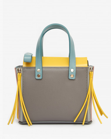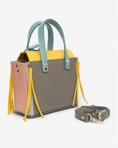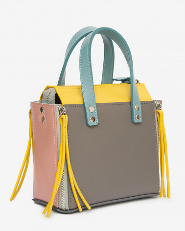На фото Тарунна:сумка у поєднанні сірого, рожевого, жовтого та блакитного кольорів.