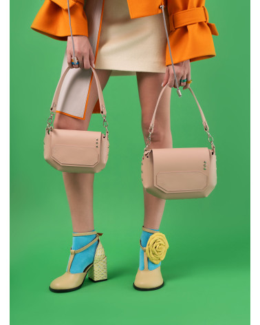 Корпус виготовлено з натуральної шкіри українського виробництва. Основне відділення закривається на кришку-клапан, магніт та блискавку. Всередині сумочки одне відділення та кишенька з фетру для ключів/телефону/дрібничок.