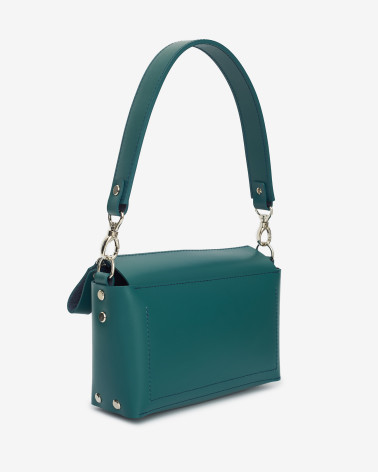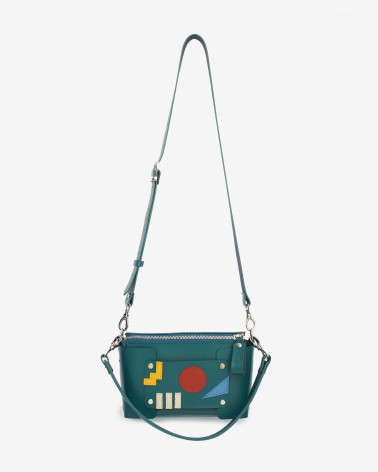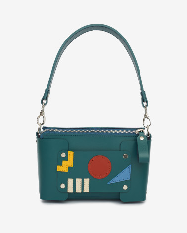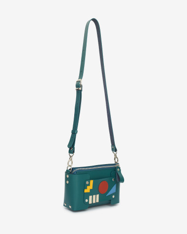 На фото Несо:сумка у смарагдовому кольорі та доповнена геометричною аплікацією.