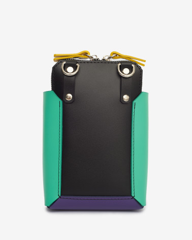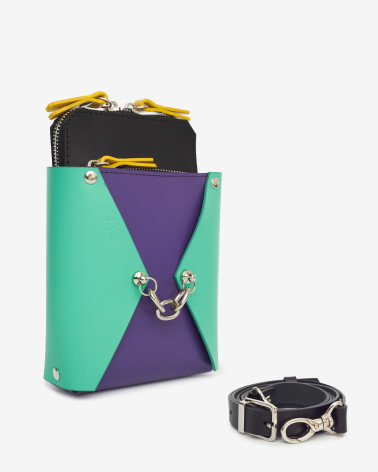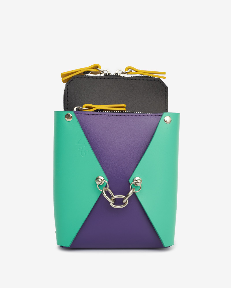 На фото Талія:сумка у поєднанні чорного, мʼятного, фіолетового та жовтого кольорів.