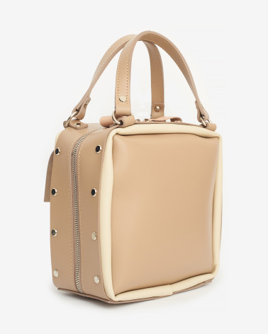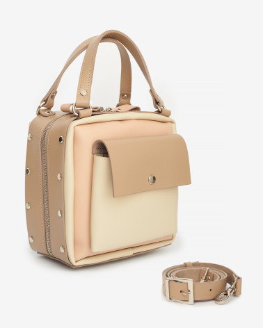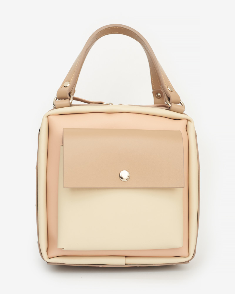 Корпус виготовлено з натуральної шкіри українського виробництва. Основне відділення закривається на блискавку. Всередині сумочки одне відділення та кошеня з фетру для телефону/ключів/різних дрібниць. Блискавка крізь усі грані сумочки дозволяє максимально її відкрити, а спеціальні бокові стопори контролюють, щоб увесь вміст лишався всередині. Широка коротка ручка дозволяє надзвичайно зручно носити сумочку у руці чи на передпліччі. Ззовні сумочку доповнено кишенею, яка закривається на замок та дозволяє легко та швидко знаходити найнеобхідніше. У комплекті є зйомна довга ручка.
