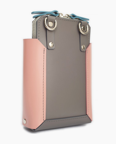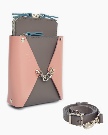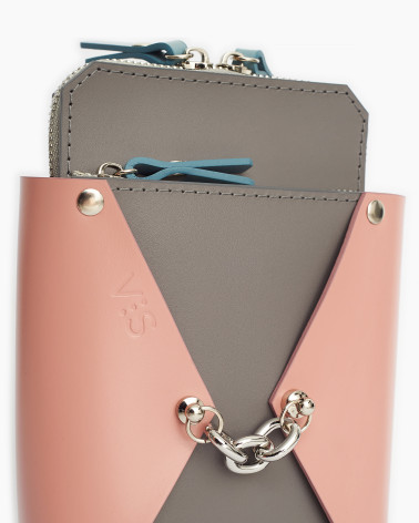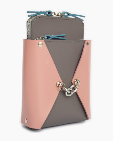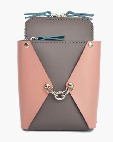 На фото Талія:сумка у поєднанні сірої, рожевої та блакитної шкіри.