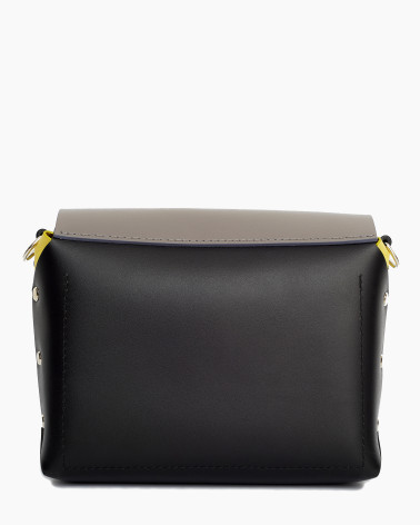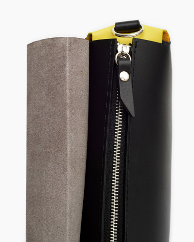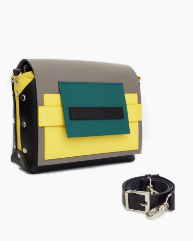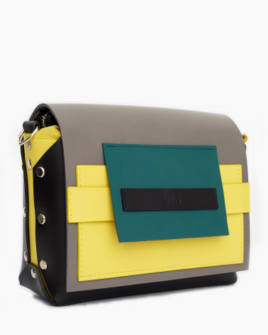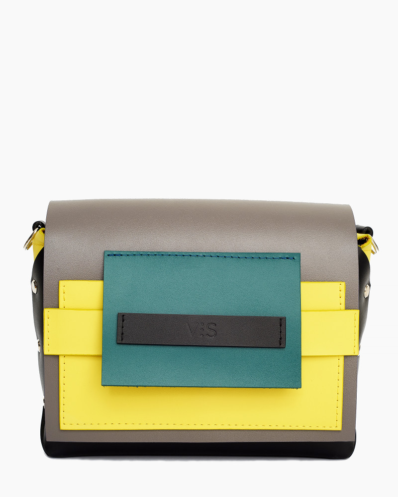 На фото Саїф:портфель у поєднанні чорного, жовтого, смарагдового та сірого.