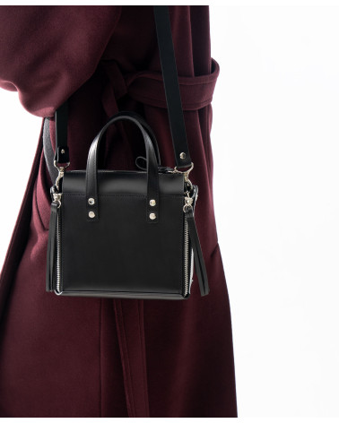 Ззовні сумочку доповнено короткими ручками, щоб зручно носити у руці. Блискавки, якими скріплено основні деталі сумочки, мають декоративних характер та не відкриваються. У комплекті є довга ручка, з регулюванням довжини.