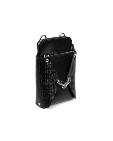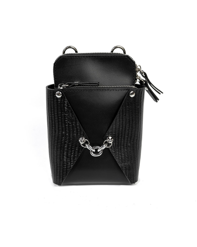 Корпус виготовлено зі шкіри українського виробництва. Основне відділення закривається на блискавку. Всередині сумочки одне відділення. Ззовні модель доповнено зручною кишенею на блискавці. Модель Талія:сумка створена, як варіація сумки для телефону. Тому, залежно від розміру вашого телефону, його можна зручно розміщувати у зовнішній кишені чи в основному відділенні сумки. У комплекті є довга зйомна ручка.