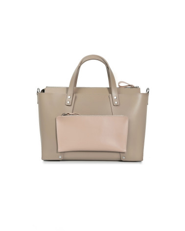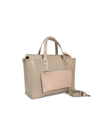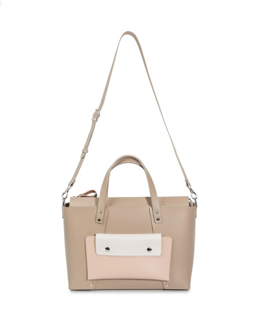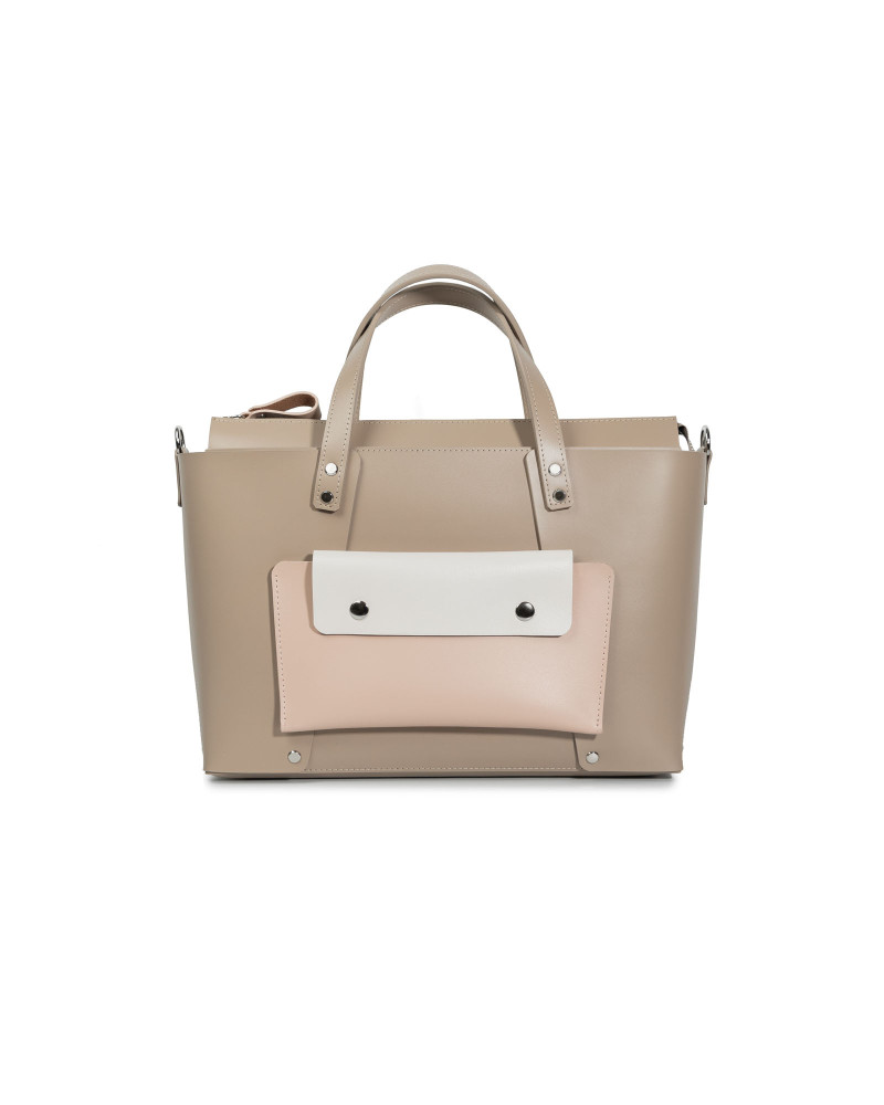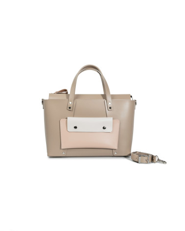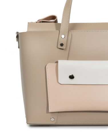 На фото Сільвія:сумка у поєднання бежевого, білого та пудрового кольорів.