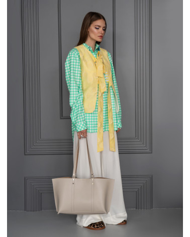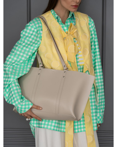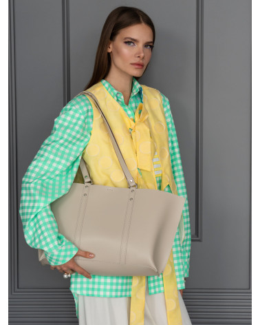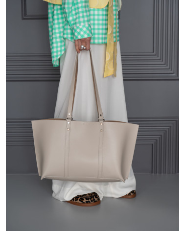 Корпус виготовлено з натуральної шкіри українського виробництва. Основне відділення закривається на магніт. Всередині шопперу є зйомний гаманець-клатч, виготовлений також зі шкіри. Його можна використовувати як другу сумку, клатч, а також він допомагає швидко "переїжджати" із сумки в сумку.