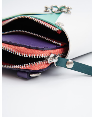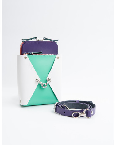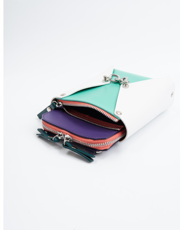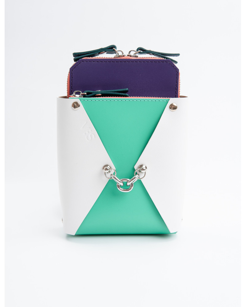 На фото Талія:сумка у поєднанні білого, мʼятного, фіолетового та рожевого.