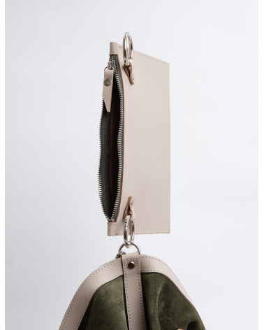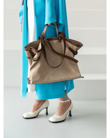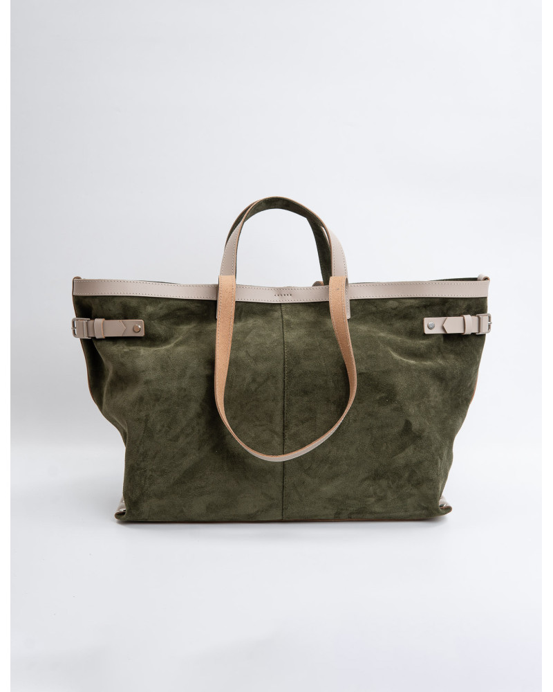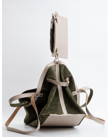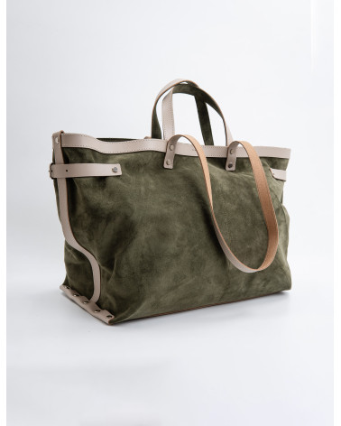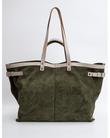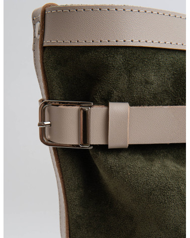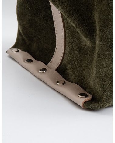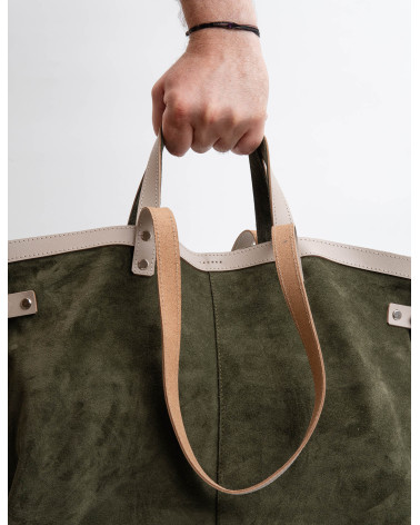 На фото шоппер у поєднанні оливкової замші та шкіри у кольорі айворі.