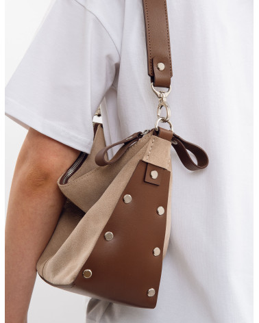 Корпус виготовлено зі шкіри українського виробництва. Для цієї моделі ми використовуємо шкіру у двох товщинах. Більш щільну, для основних деталей та ручок. Та мʼякішу для корпусу сумочки. І тому, маємо надзвичайно велику палітру кольорів для поєднання у цій моделі.