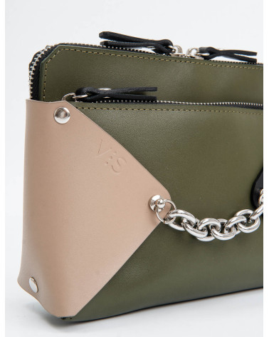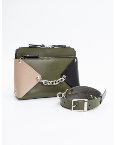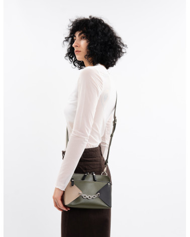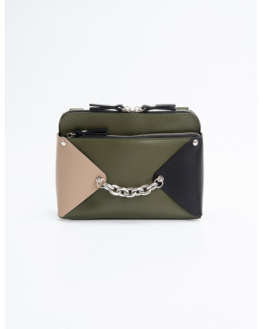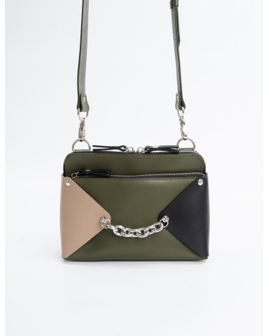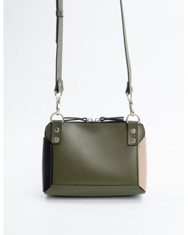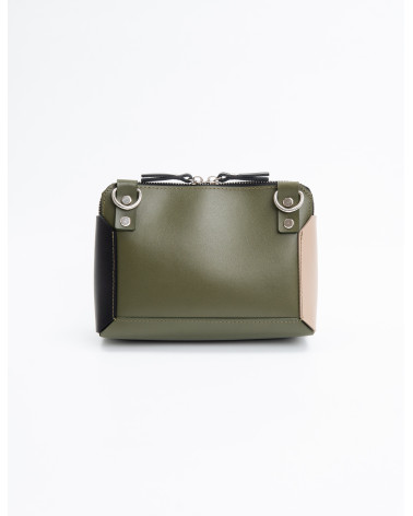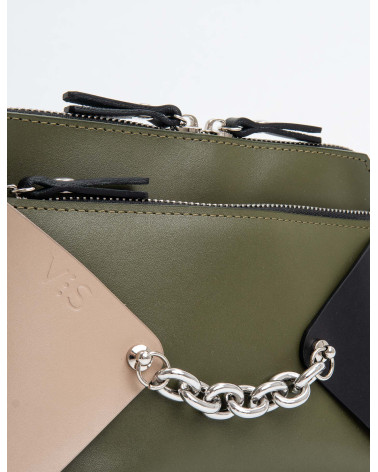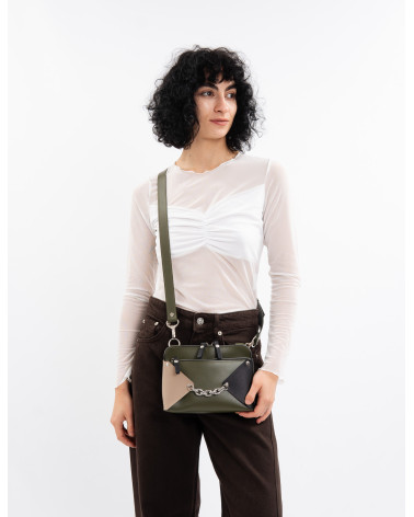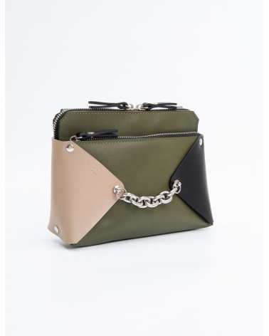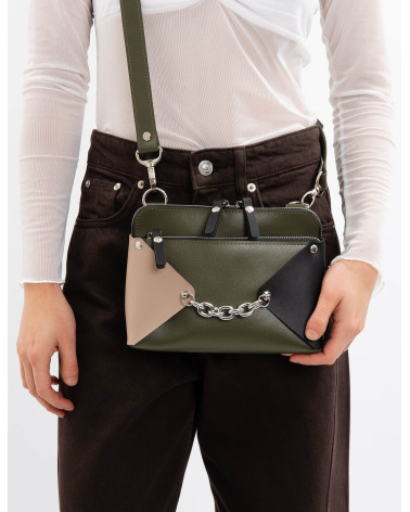 На фото Талія:сумка у поєднанні чорного, оливкового та бежевого.