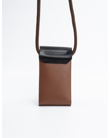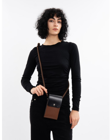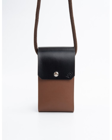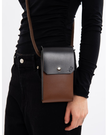 Корпус виготовлено зі шкіри українського виробництва. Основне відділення закривається на кришку-клапан та кнопку. Всередині сумочки два відділення. Ми рекомендуємо використовувати одне відділення сумочки для телефону, а друге у якості гаманця/ кейсу для павербанку/ карток, ключів, документів. У комплекті є ручка-шнур, яка дозволяє досить зручно носити сумочку crossbody чи, змінюючи довжину ременю, підкреслювати талію.